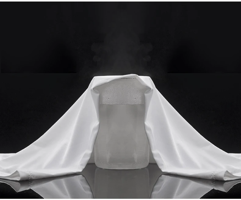 Het glas bevat heet water en de tulband (hoofdband) wordt over het glas geplaatst. De verdamping van waterdamp is zichtbaar, wat aangeeft dat het materiaal goed ademend is en het ademhalen niet belemmert.